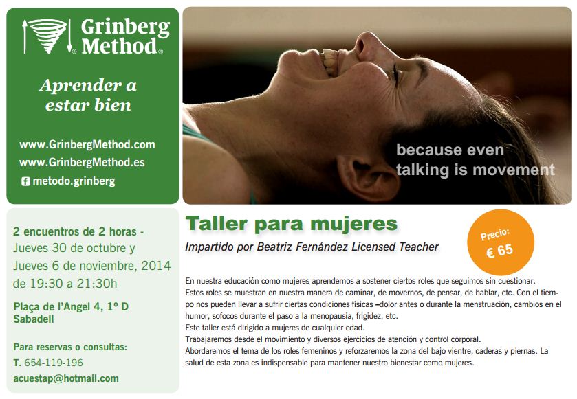 Próximo taller para mujeres en Sabadell, impartido por Beatriz Fernández – Profesora Autorizada del Método Grinberg. Éste taller es muy práctico y está dirigido a mujeres de cualquier edad.