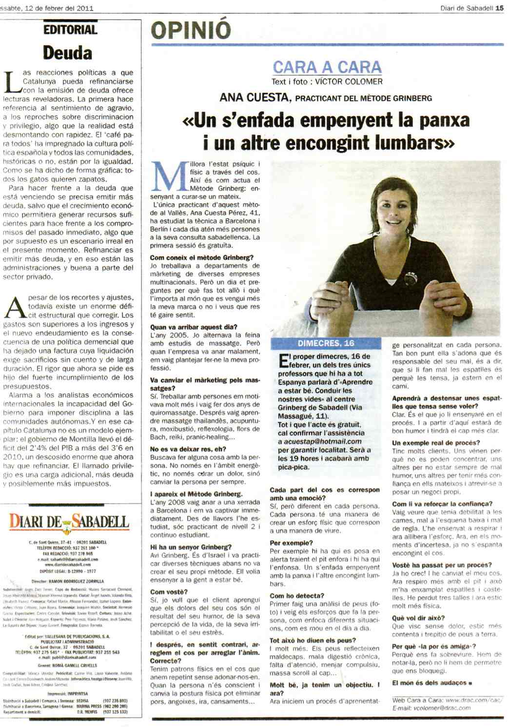 El día 12 de Febrero de 2011, por ser la única Profesional del Método Grinberg en Sabadell, tuve la oportunidad de ser entrevistada por Víctor Colomer en la sección Cara a Cara del Diari Sabadell.